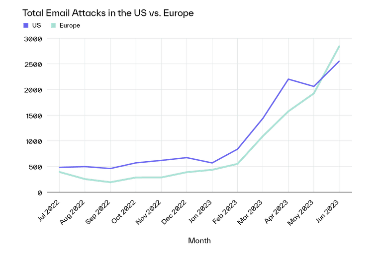According to the data, the total number of email attacks steadily increased in both the United States and Europe over the course of the year. However, email attacks in Europe increased at a slightly faster rate. While total attacks in the United States grew by 5x between June 2022 and May 2023, Europe saw total attacks increase by 7x during the same period—to an average of 2,842 attacks per 1,000 mailboxes in May.
