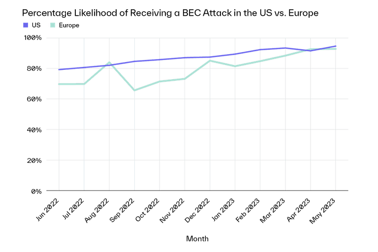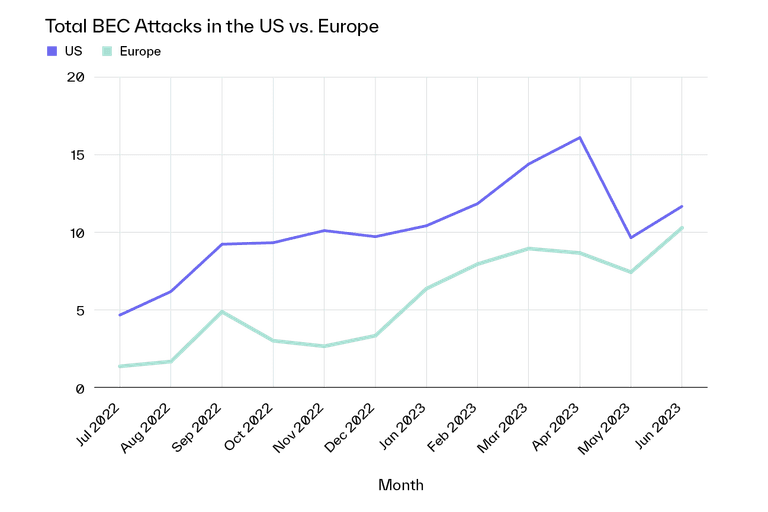 When evaluating BEC attacks specifically, the disparity was even greater. Between June 2022 and May 2023, BEC attacks in the United States increased by just over 2x. Meanwhile, in Europe, there was a 10x increase in BEC attacks, from an average of one attack to an average of 10 attacks per 1,000 mailboxes.
