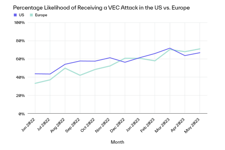 The data also tracked the likelihood of a company receiving a business email compromise or vendor email compromise (VEC) attack throughout the year. Similarly, both the United States and Europe saw these risks increase throughout the year. However, while in the United States, the trajectory of these increases was fairly steady, in Europe, the data showed a spike in the likelihood of receiving a BEC or VEC attack in August. One reason for this sudden increase may be due to a cultural difference between Europe and the United States when it comes to summer holidays.