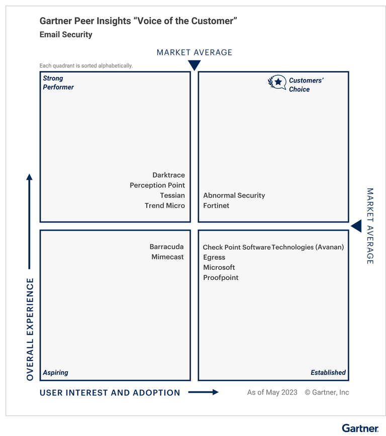 In addition to these awards, the customer value of the Abnormal platform has been peer-recognized, as Abnormal was named a 2023 Customers’ Choice for Email Security on Gartner Peer Insights. Abnormal was one of only two vendors placed in the upper-right quadrant of the “Voice of the Customer” quadrants, earning the Customers’ Choice distinction as a result of “[meeting or exceeding] both the market average Overall Experience and the market average User Interest and Adoption.” As of today, Abnormal has an average rating of 4.8 stars in Gartner Peer Insights and a 98% Would Recommend rating from customers.