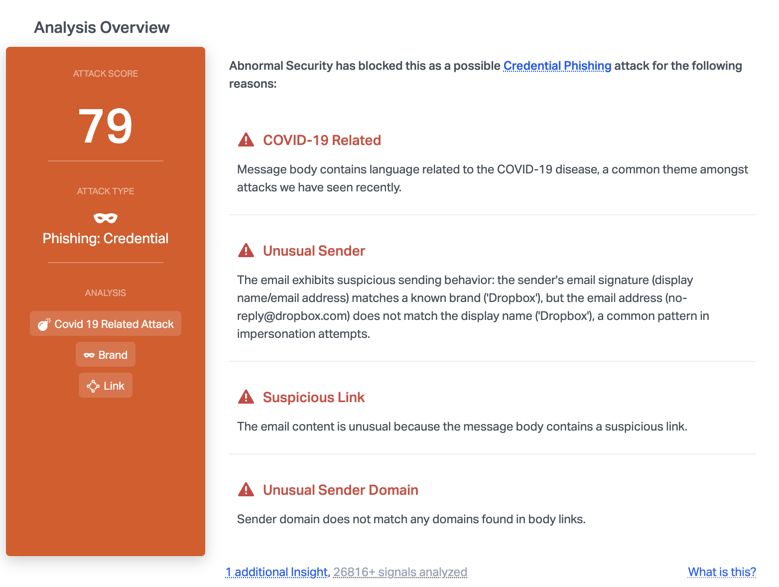 Abnormal can stop this attack due to the unusual sender domain where it does not match any domains found in body links. In addition, the content of the email is related to COVID-19, a common theme right now for cyber attackers who are looking to take advantage of the pandemic.