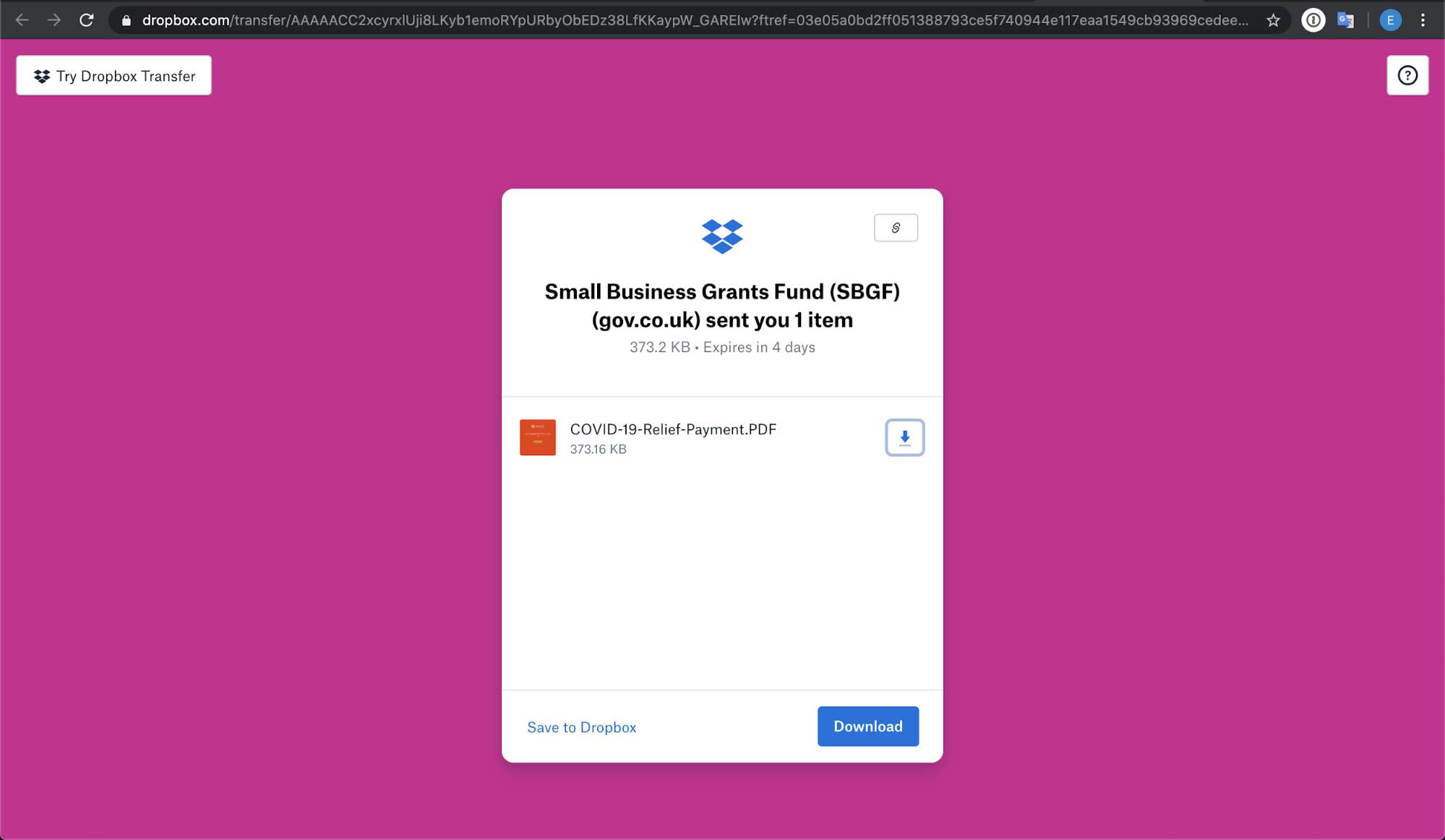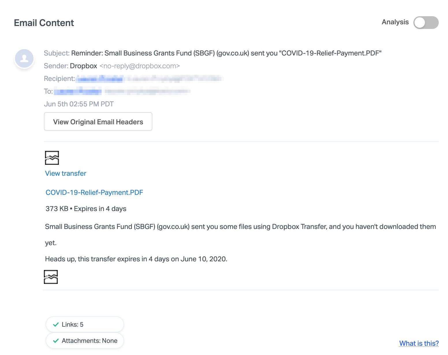 There is a sense of urgency in the message, which states, "Heads up, this transfer expires in 4 days on June 10, 2020.” It appears that if the recipient doesn't download the file within the given timeframe, the file will expire and they might assume that the opportunity to receive relief funding will be missed or delayed. And even for vigilant email recipients who check the sender address, an automated message from the dropbox.com domain does look innocuous enough to at least click on the links provided.