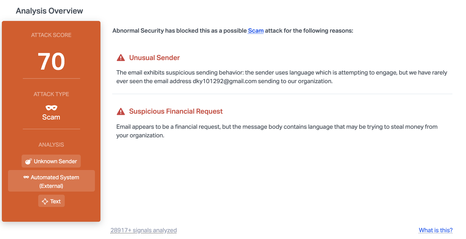 Abnormal can detect this attack because of the unknown, unusual sender. Despite using a Gmail address, which inherently has a good reputation, the specific email had never been used in communication with the organization, and it appears to be automating an external system. When combined with the text of the email, it appears malicious enough that Abnormal can block it before it reaches employees.