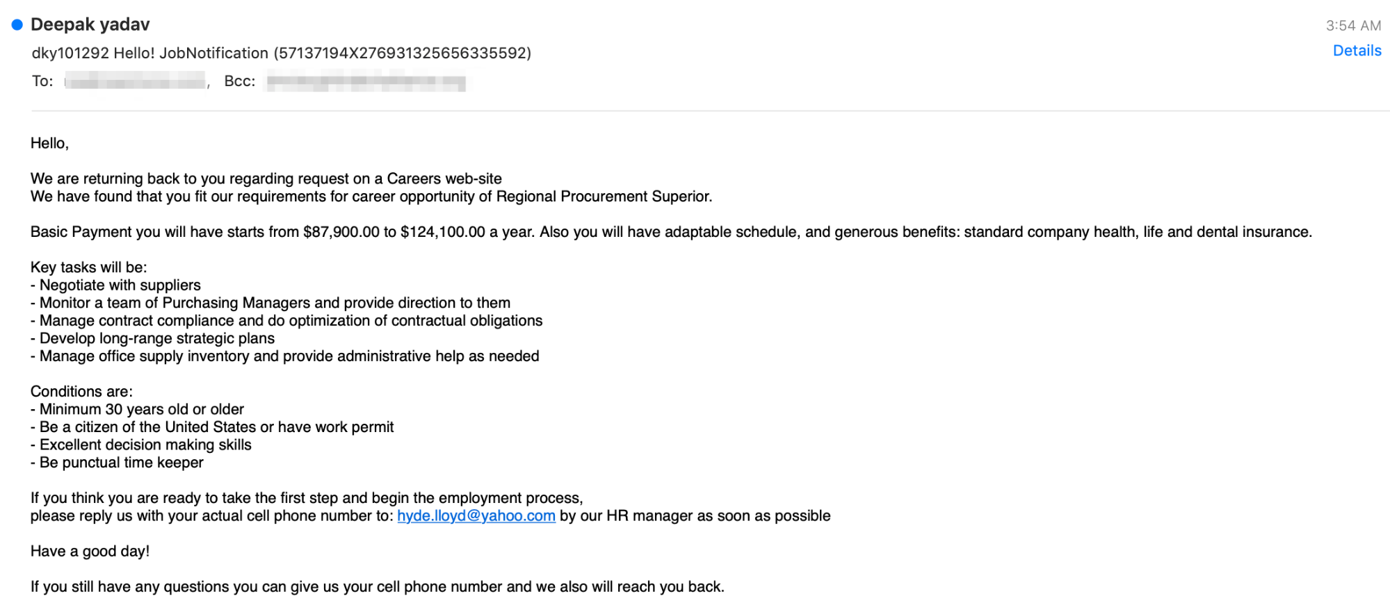The attack impersonates an email from a recruiter at a non-specified career website. It appears to be directed to the recipient specifically. It is well written and contains pleasantries, a brief description of the job requirements, the payment amount, pay schedule, conditions, and the HR contact—all the major details with the exception of the company name. At the conclusion of the email, the recipient is directed to reply to the email with their phone number for further consideration.