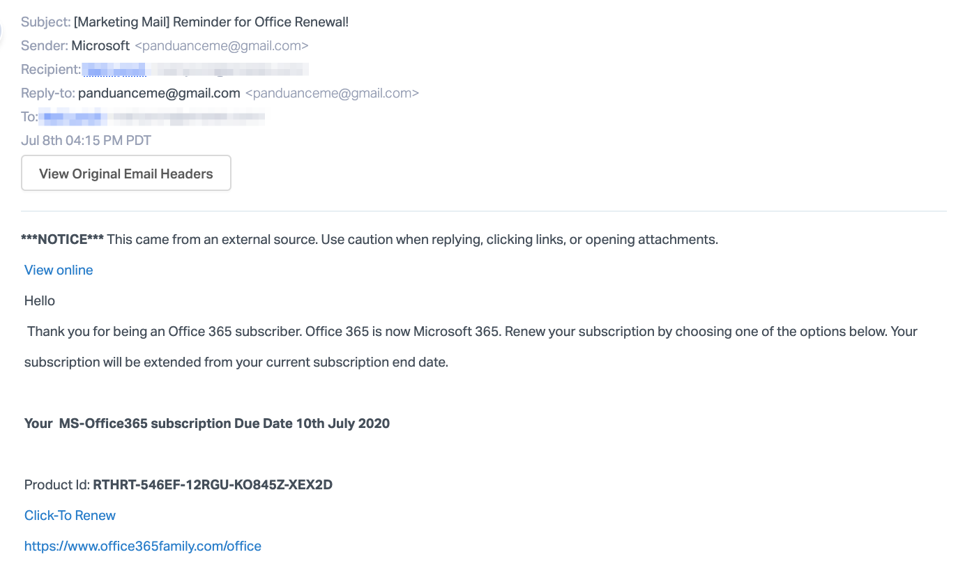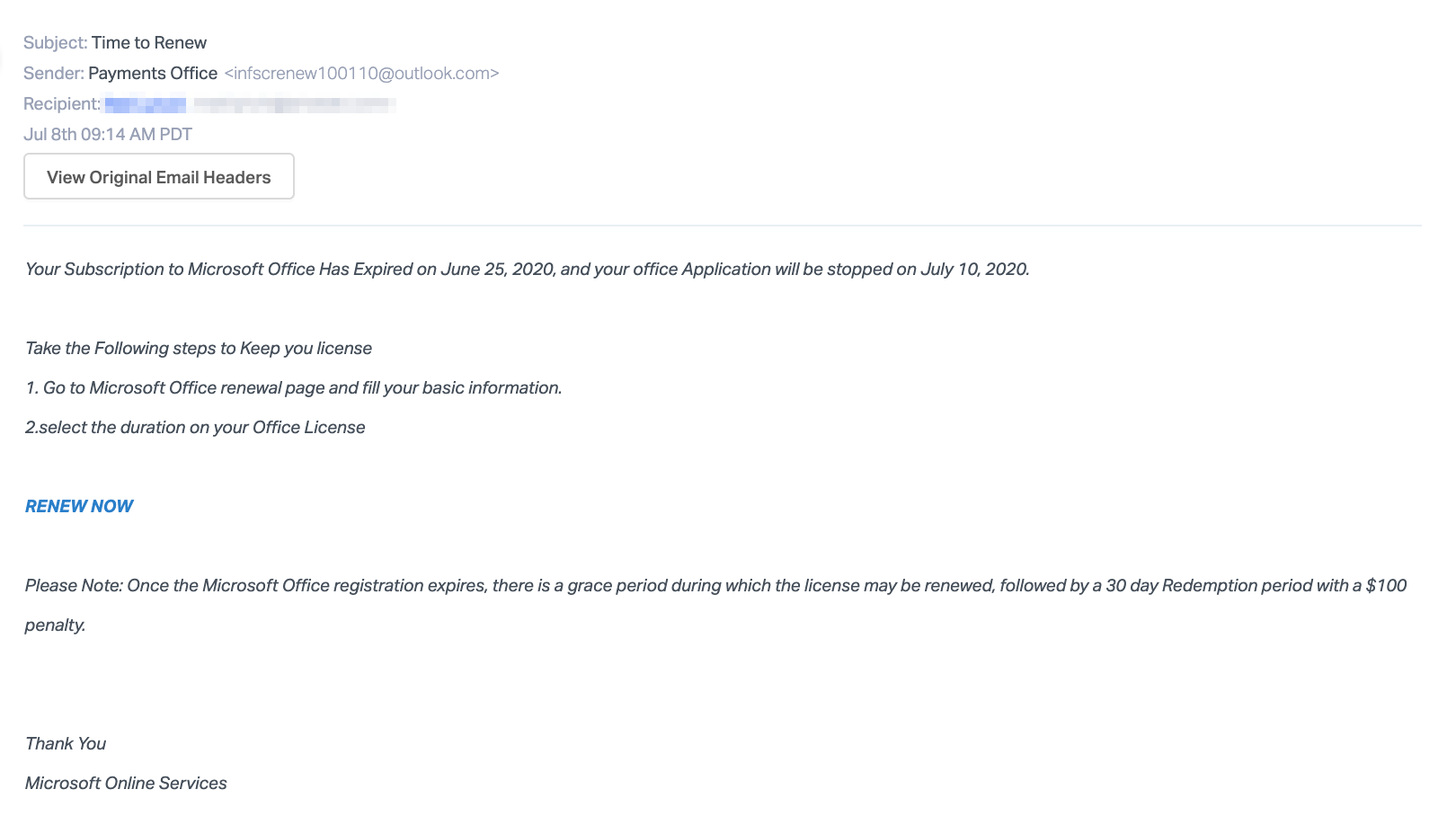 Microsoft Office offers one-time purchase and subscription plans and has numerous official resellers for its products. Scammers use this fact as an opportunity to impersonate Microsoft and their resellers in order to steal sensitive user data, as well as for financial gain. In these attacks, cybercriminals impersonate renewal emails from Microsoft to steal sensitive user information and money.