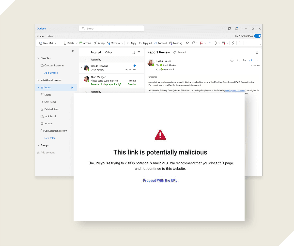 URL Rewriting rewrites potentially suspicious links and warns users before they proceed, engaging users to use their best judgment.
