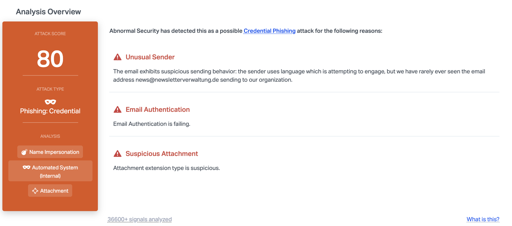 Abnormal detected this malicious email due to the unusual sender, the failed email authentication, and the suspicious attachment. These three things combined provide enough insight to make this email dangerous and stop it before it hits inboxes.