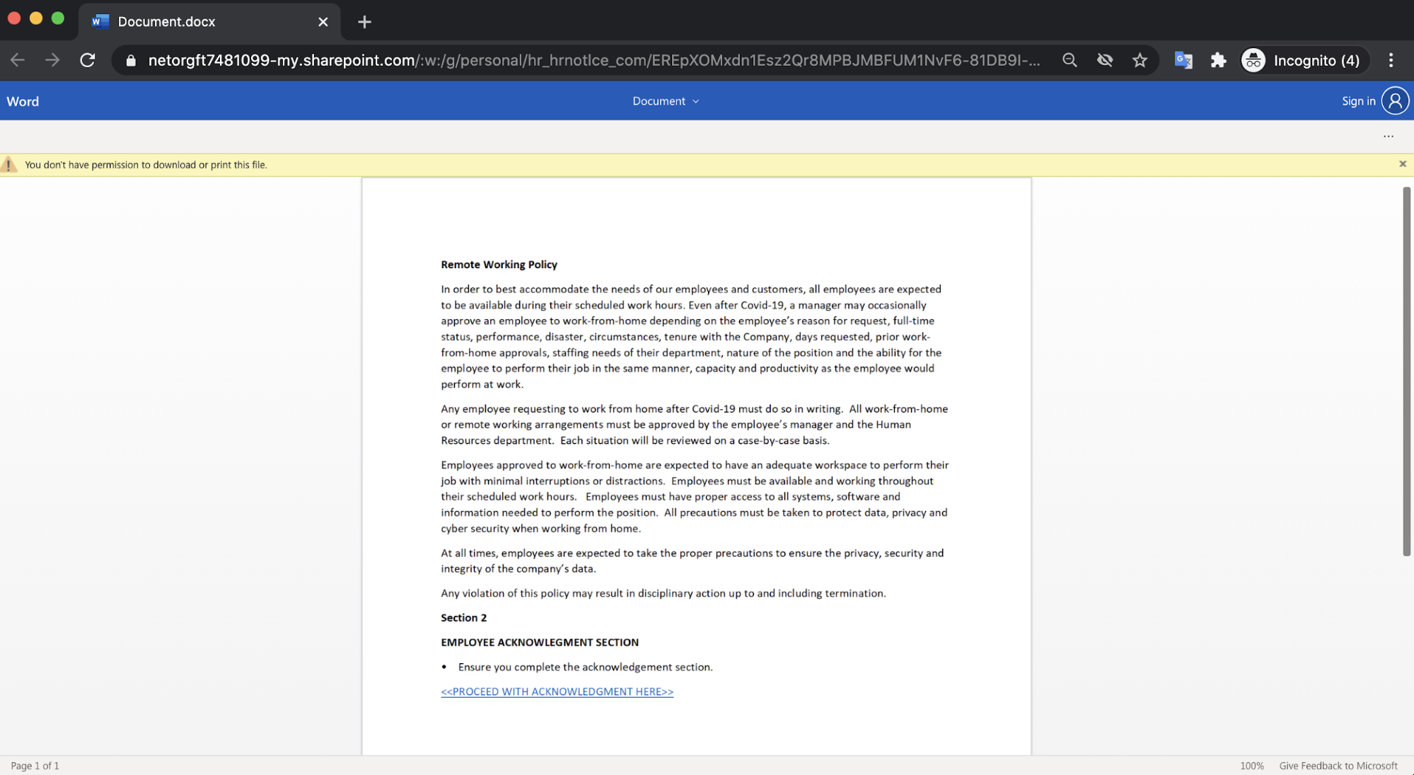 The email contains an HTML attachment containing the recipient’s name, which encourages the recipient to open it. By clicking on the attachment, the user is redirected to a SharePoint document with new instructions on the company’s remote working policy. Underneath the new policy, there is text that states “PROCEED WITH ACKNOWLEDGEMENT HERE”.