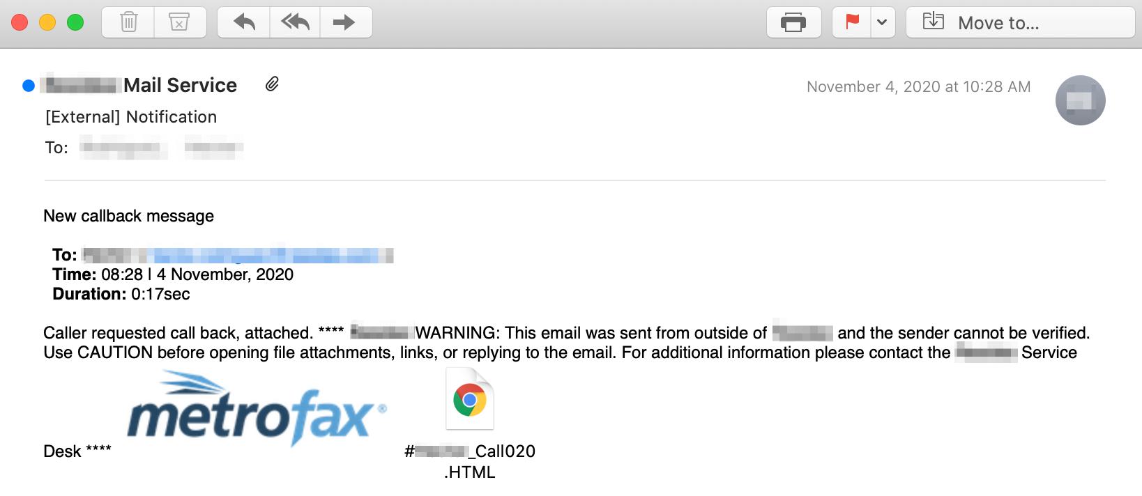 The email is sent to a specific employee, requesting a call back with an attachment and text that make it seem like the recipient has received a voicemail.