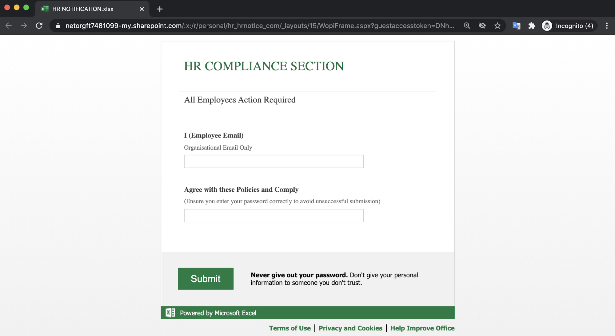 If the recipients fall victim to this attack, the login credentials for their email account will be compromised, and the attackers will gain access to sensitive corporate and personal information. Although there is an explicit message telling those who fall on this landing page that they should never give out their passwords, there may be some number of recipients who still input their credentials.