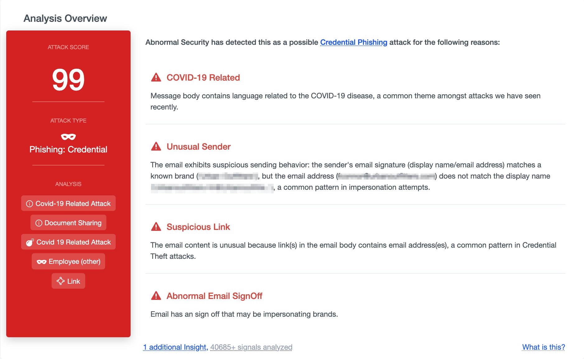 These signals, combined with a dramatic increase in COVID-19 phishing attacks, work together to inform us that this message is malicious. As a result, this message is blocked from inboxes before it can lead to compromised employee accounts.