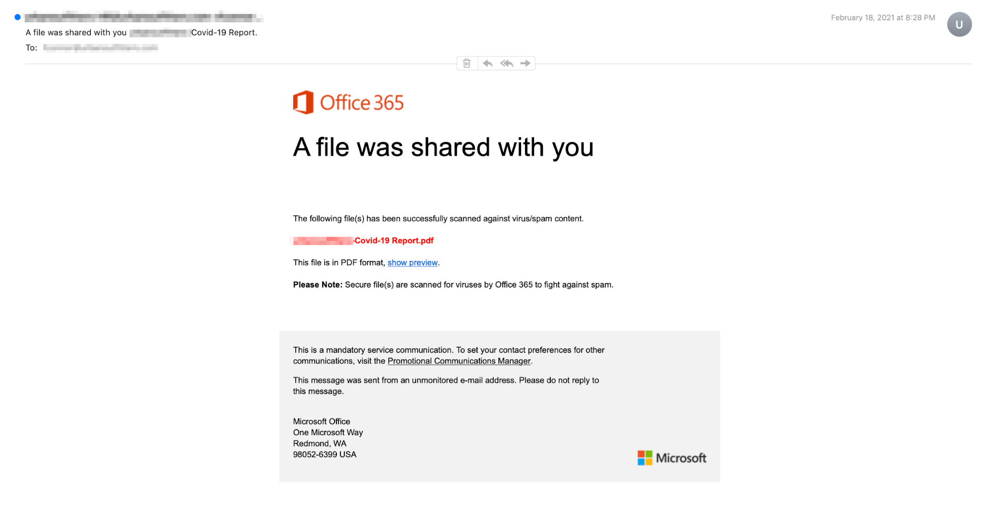 The impersonated O365 email contains a document that poses as a PDF regarding a "Covid-19 Report". The email itself includes the Microsoft logo in the footer, increasing the visual legitimacy of this message. The email also states that the file is secure and has been scanned for viruses, which may dupe the recipient into following the link.