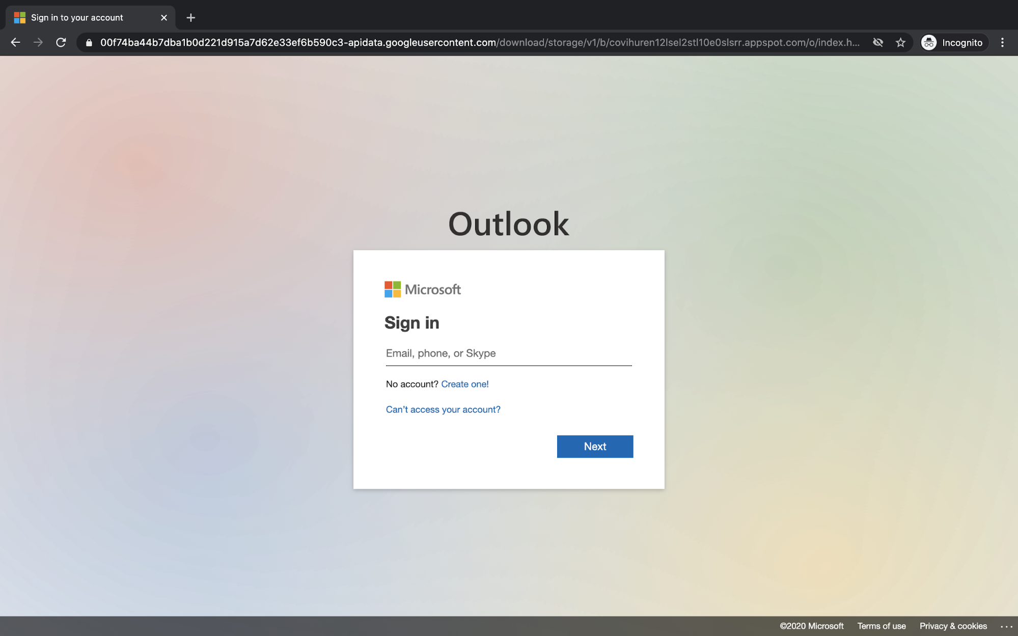 Although this appears to be the legitimate Microsoft login page, the URL 'googleusercontent.com' clearly has no relation to Microsoft. If the recipient were to input their login information to "view the document" that they just received, their credentials would be compromised by the attacker.