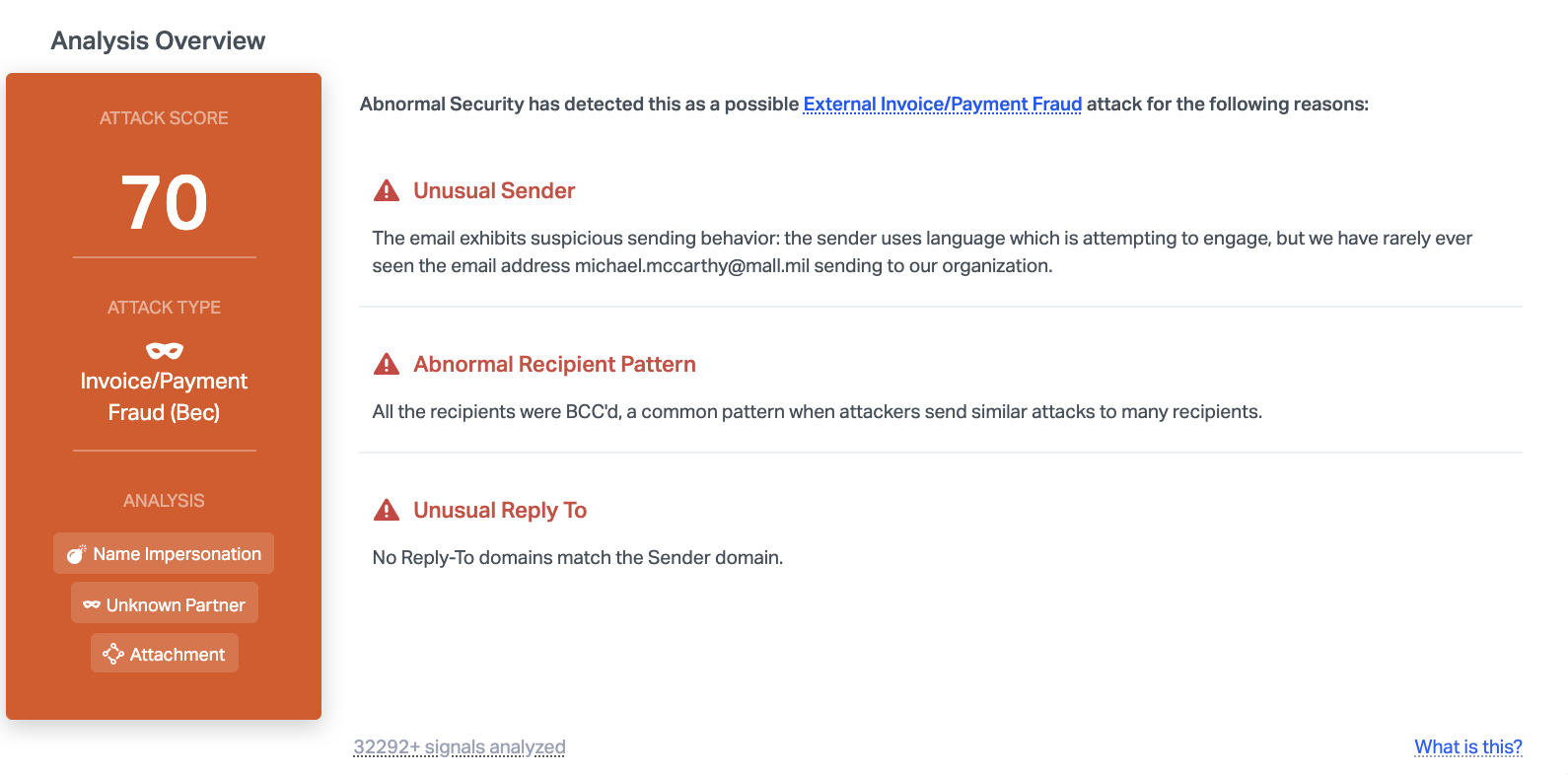 Abnormal is able to detect this malicious email due to the unusual sender, the unusual reply-to address, and the fact that all recipients were BCC'ed, a common pattern in cyber attacks. In addition, the content of the email indicates that it may be related to financial fraud. Combined together, this provides enough information to understand that this email is malicious, and it is blocked before reaching inboxes.