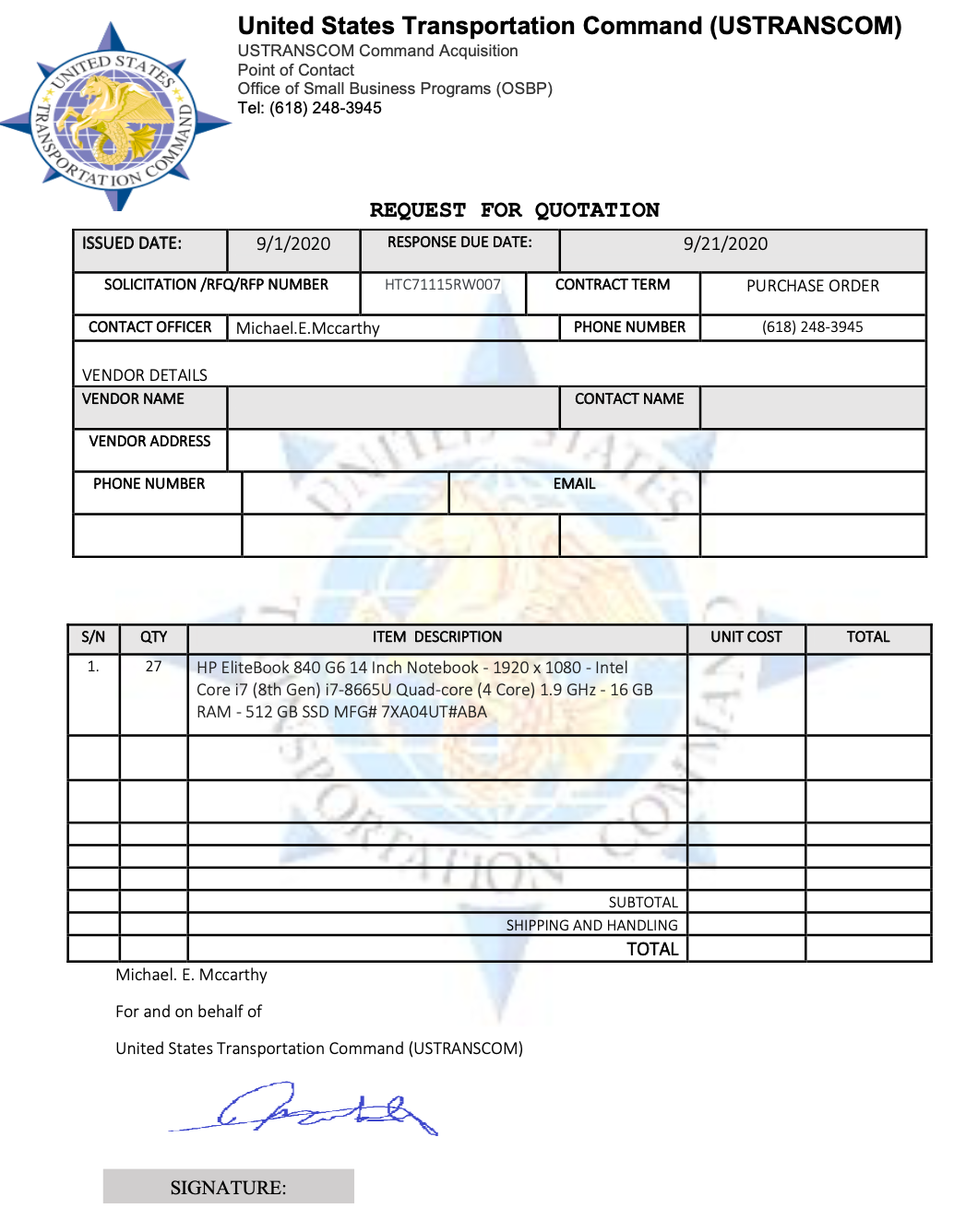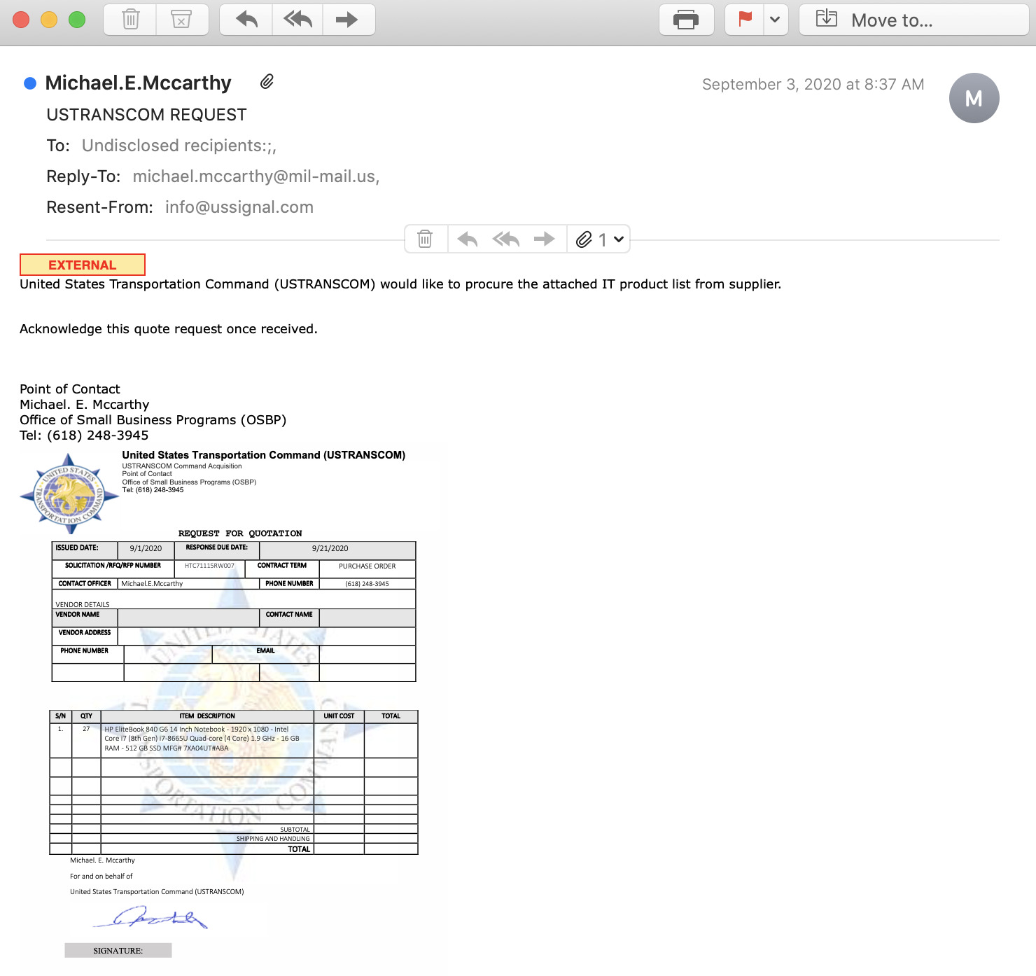 Sending fraudulent purchase orders for goods and services is a common tactic attackers use to receive free merchandise. In this attack, attackers are impersonating the United States Transportation Command Office of Small Business Programs and sending an RFQ in order to steal goods from their targets.