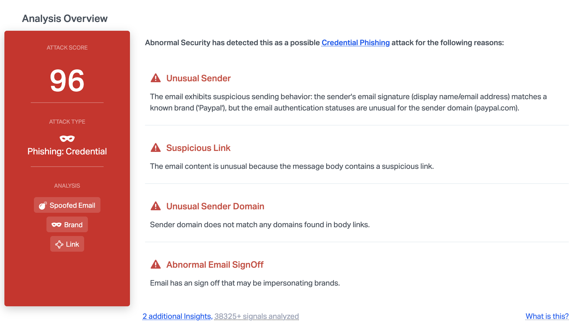 Abnormal was able to detect this malicious email due to a variety of factors, including the unusual sender domain and the suspicious link. In addition, the unusual authentication statuses and email sign off indicate that it may be malicious—causing Abnormal to block it before it reached end users.