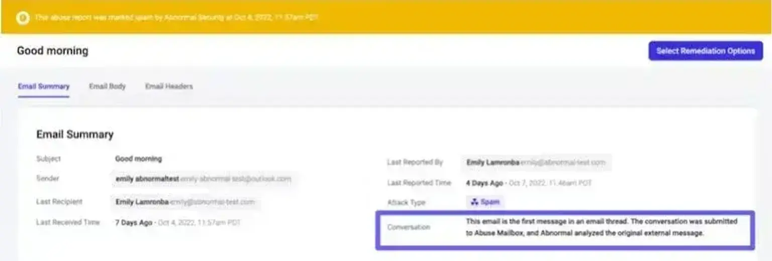 Now, when employees submit multi-forwarded email threads to the Abuse Mailbox Automation for analysis, Abnormal will automatically triage and remediate them within seconds, adding to the 4x time savings SOC teams can achieve. The Email Summary view now includes context about forwards or replies within the message. Analysis details will show the origin of the email, i.e. “this email is the first in a thread with two replies.”
