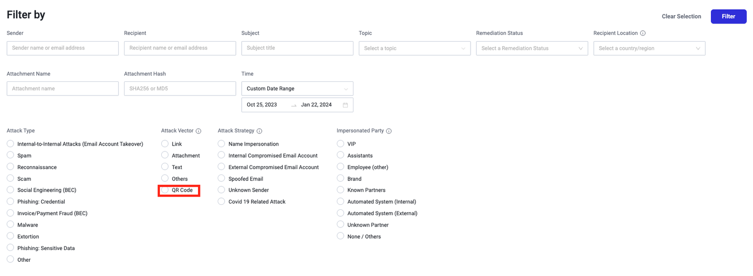 Customers can now filter Threat Log to view all attacks remediated by the QR code detector. This enhancement provides valuable insights into the frequency of QR code attacks and allows for a more targeted analysis of security threats.