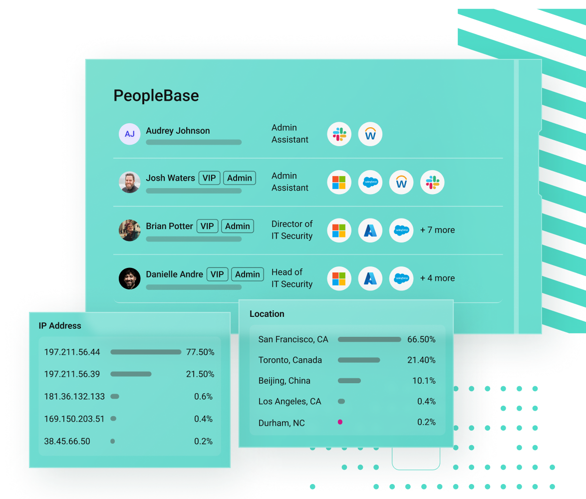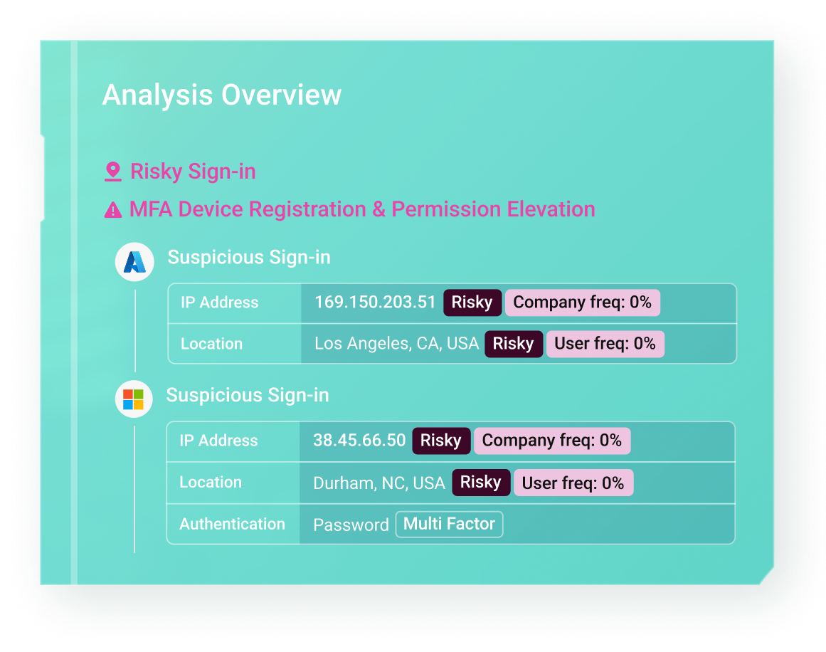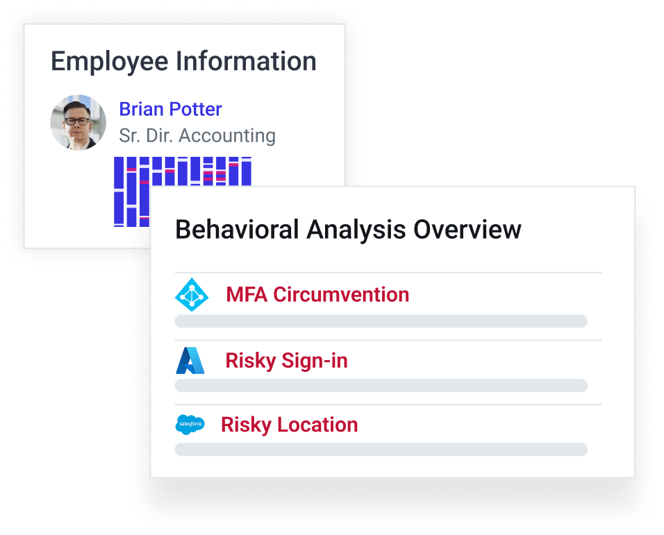 Human behavior AI automatically analyzes authentications signals, communications, and suspicious applications, including logins from unusual locations, abnormal VPN usage, or new MFA registrations.
