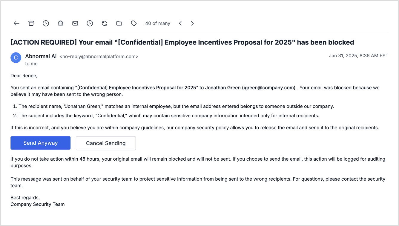 Alert senders instantly with AI-powered guidance so they can delete or confirm messages—resolving issues without burdening security teams.
