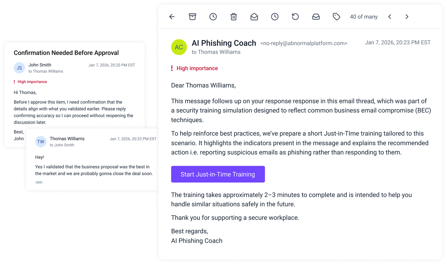 AI Phishing Coach now includes Business Email Compromise (BEC) simulations to help organizations test against one of the most costly phishing threats: trust-based attacks. These simulations reflect how real attackers impersonate managers, colleagues, and subordinates to manipulate employees into taking risky actions. By modeling these social engineering techniques, security teams gain clear visibility into which users are most vulnerable.