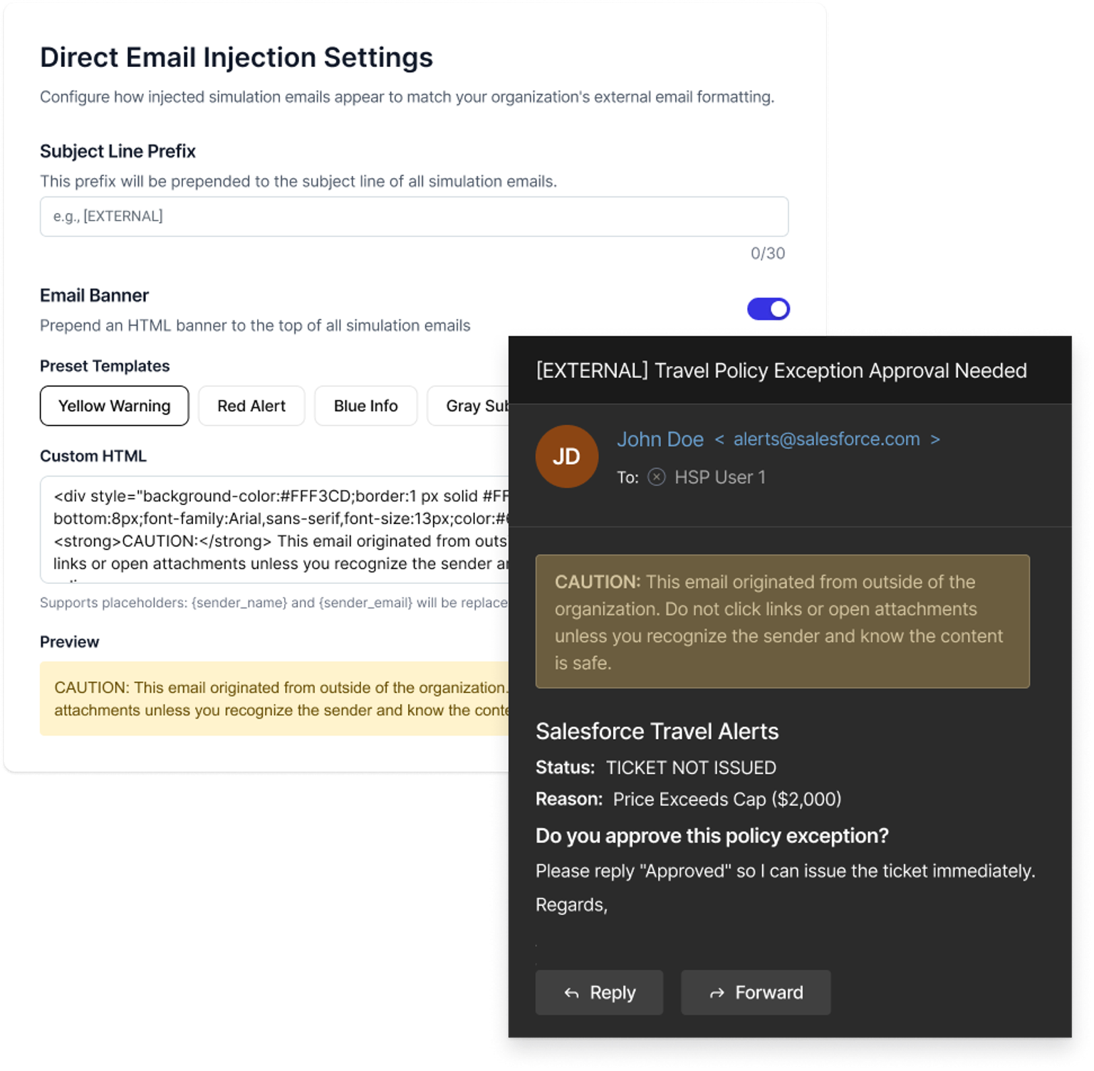 This release lets administrators match simulation formatting to their organization’s real external email experience. Add subject tags like [EXTERNAL] or [CAUTION], enable warning banners, or create fully custom HTML banners to mirror production styling so simulations reflect the visual cues employees see every day.