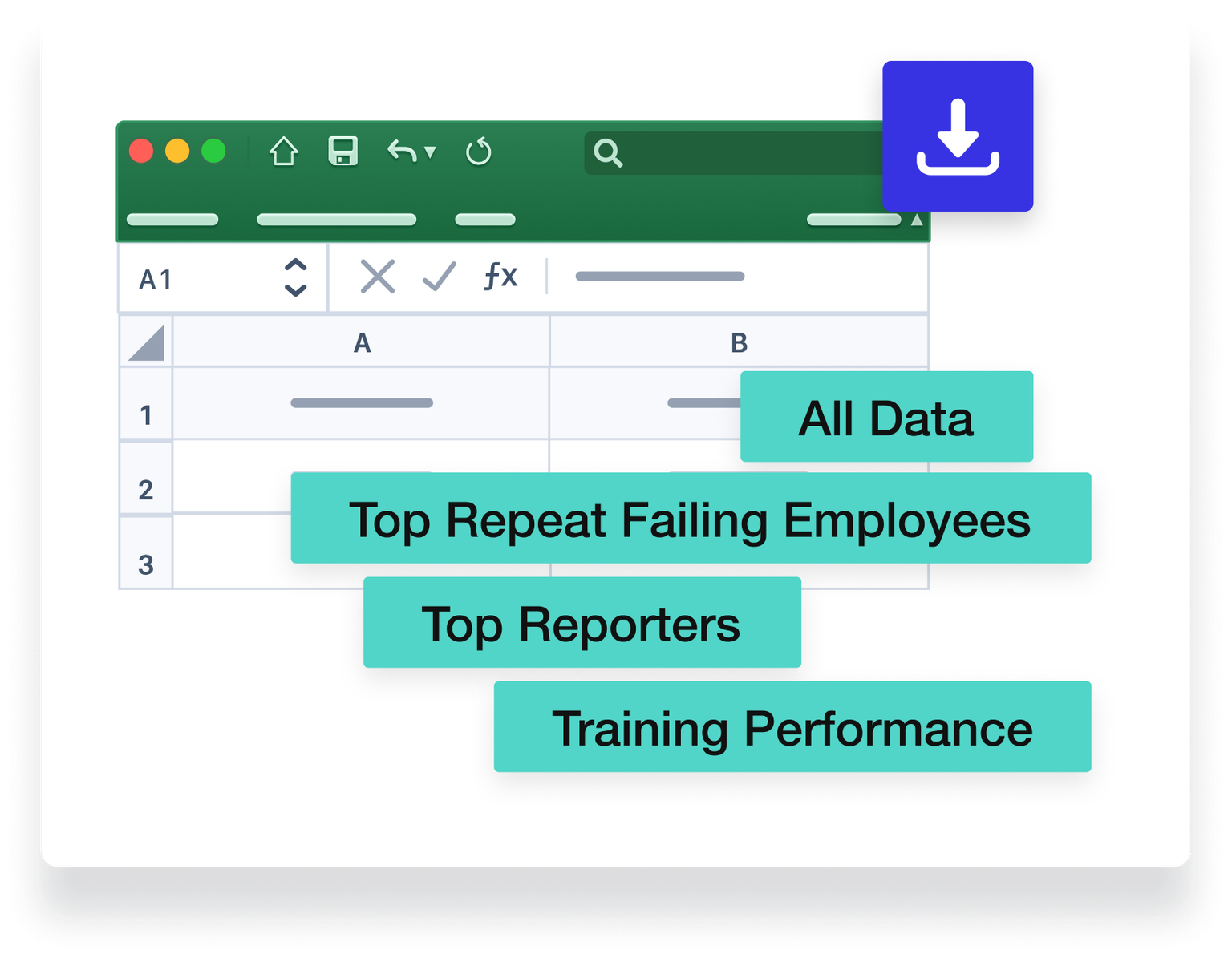 Prebuilt tabs for All Data Export, Top Failing Users, Top Reporting Employees, and Training Completion Rates
