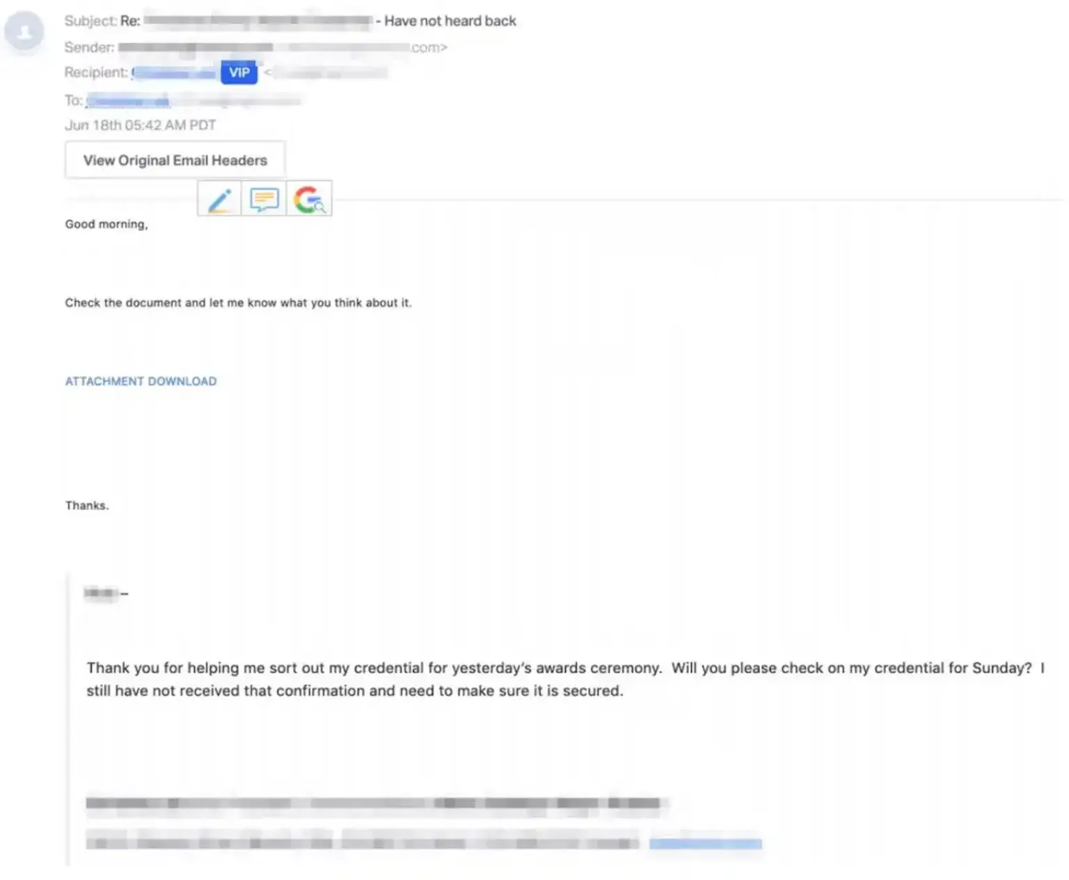 To assist with detecting hijacked thread attacks, Abnormal added text-based attributes that analyze email message body and headers to better identify malicious messages containing unrelated conversations. This enhancement is particularly powerful because hijacked conversations generate high engagement from email recipients based on the established trust from previous interactions with the email thread.