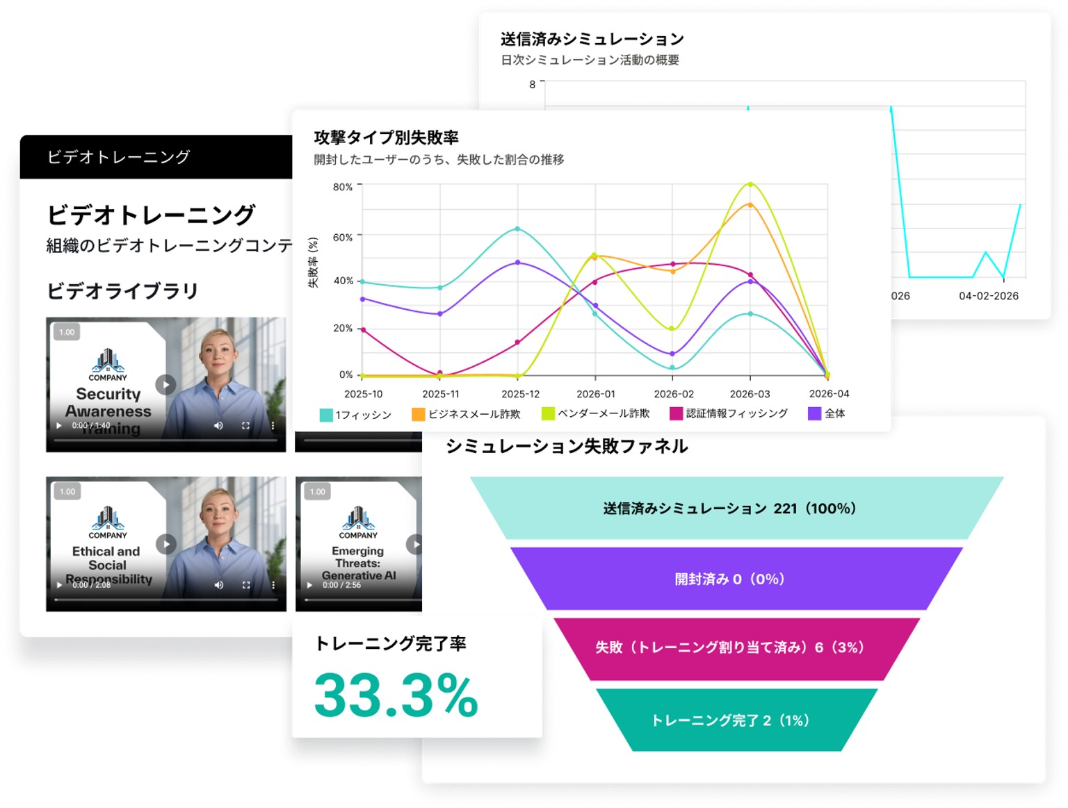 Core pages include Threat Simulations, Video Training, Reports, Risk Management, and Settings now available in Japanese