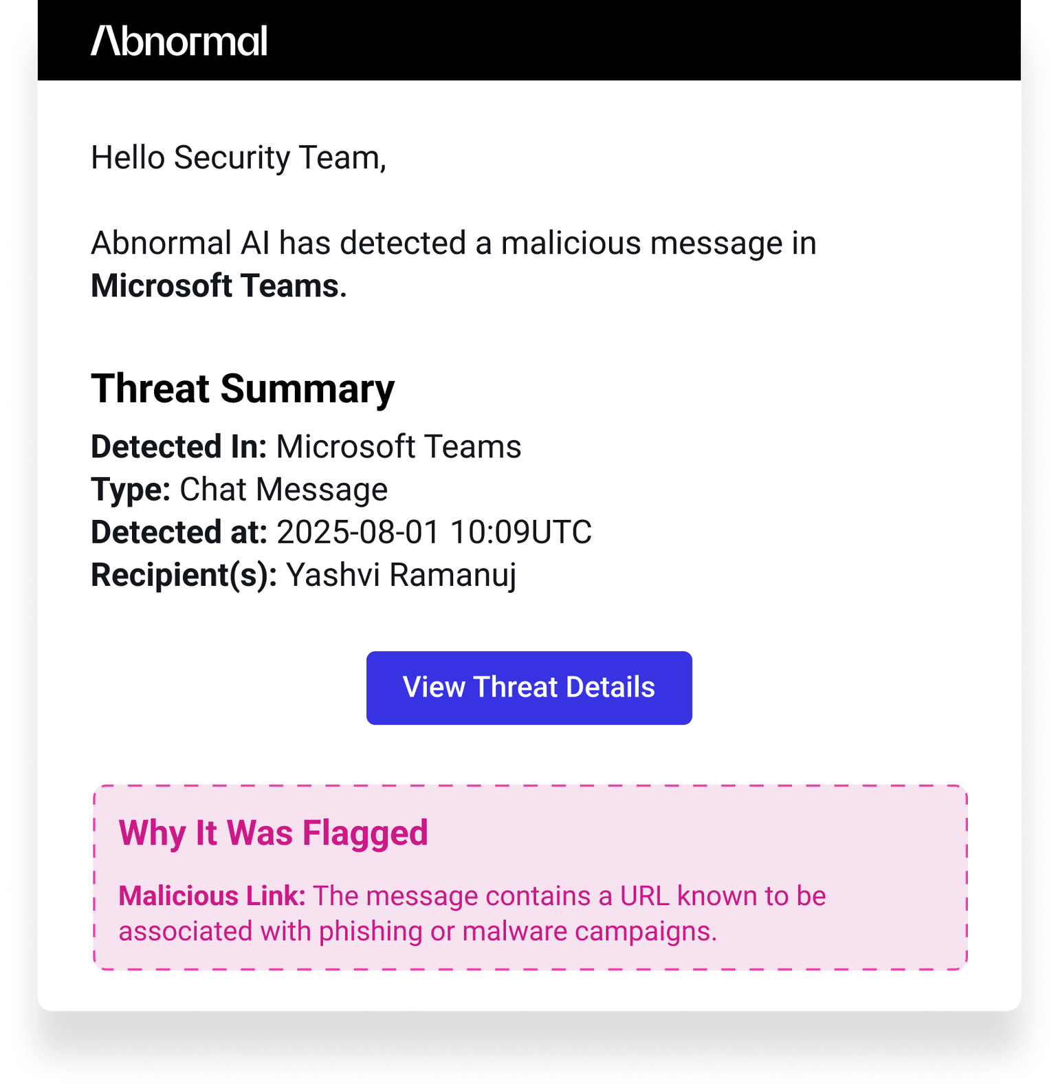 Customers can now receive automatic threat alerts via email when Abnormal detects a high-severity threat in Microsoft Teams. Alerts include key details to help security teams quickly assess and respond.